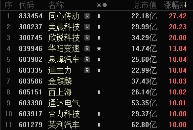 截至上午收盘,美晨科技、欣锐科技20%涨停,泉峰汽车、迪生力、金麒麟、西上海、通达电气、合力科技、英利汽车等个股10%涨停。同心传动一度触及30%涨停,最终收涨27.42%。