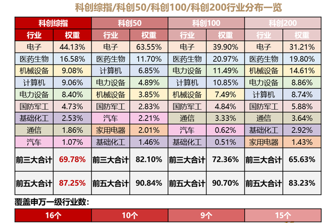 由于选股不再局限于特定的市值范围,科创综指得以广泛地覆盖了16个申万一级行业,呈现出“芯片半导体硬核主导、高端制造长尾爆发”的格局: