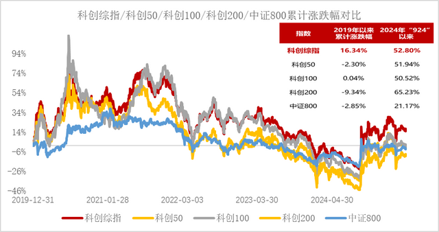 得益于科创综指全覆盖以及计入分红的编制方式,指数自基日(2019年12月31日)以来累计涨跌幅达16.34%,高于同期科创板其它指数,表明科创综指具备更具吸引力的长期表现;此外相比于市场均衡宽基中证800指数,科创板指数表现出更高弹性。
